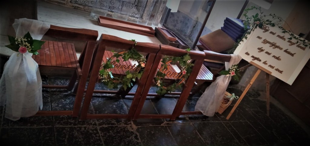Kroga sta izdelana iz vezane plošče. En grog vsebuje napis NEVESTA, drugi pa ŽENIN.