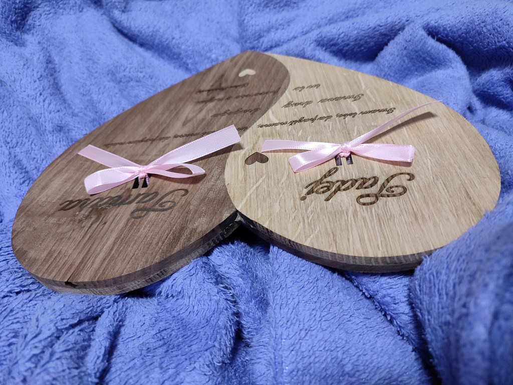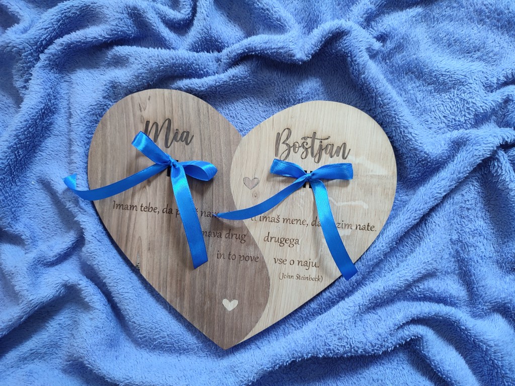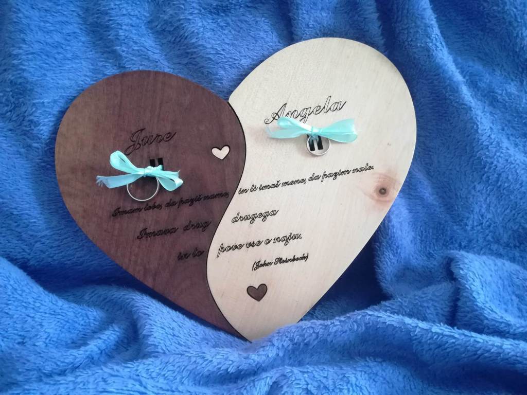 Naj bosta vajina prstana položena na unikatno držalo v obliki srca, ki simbolizira združitev dveh src v eno. Izdelano je iz kombinacije masivnega orehovega in hrastovega lesa, kjer preplet temnejšega in svetlejšega odtenka lesa ponazarja popolno harmonijo dveh polovic v celoto.