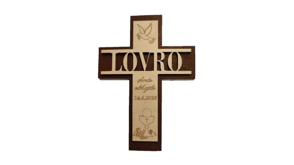 Spominski križ na prvo sveto obhajilo je lahko lep spomin spomin za prvoobhajanca. Križ je narejen iz vezane plošče. Vsebuje ime prvoobhajanca, po želji pa lahko tudi datum prvega svetega obhajila ter ime praznika. Križ ima na zadnji strani pritjeno obešalko za obešanje na steno.