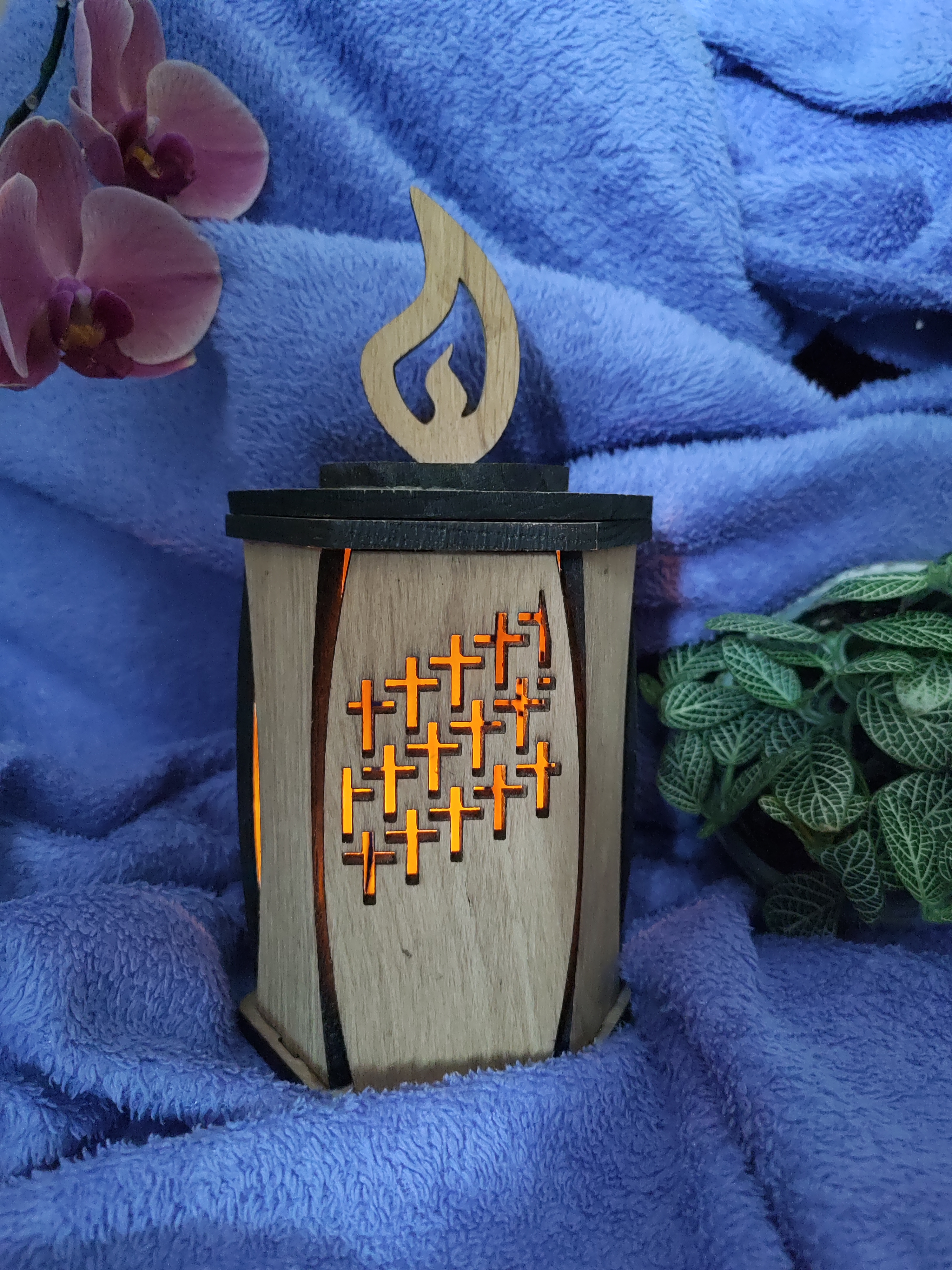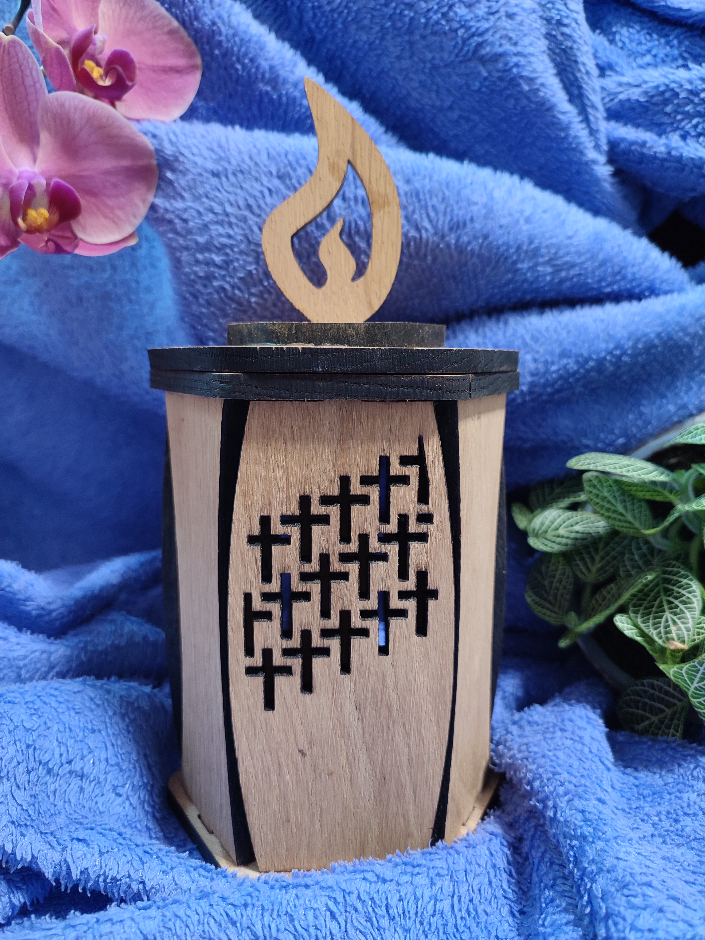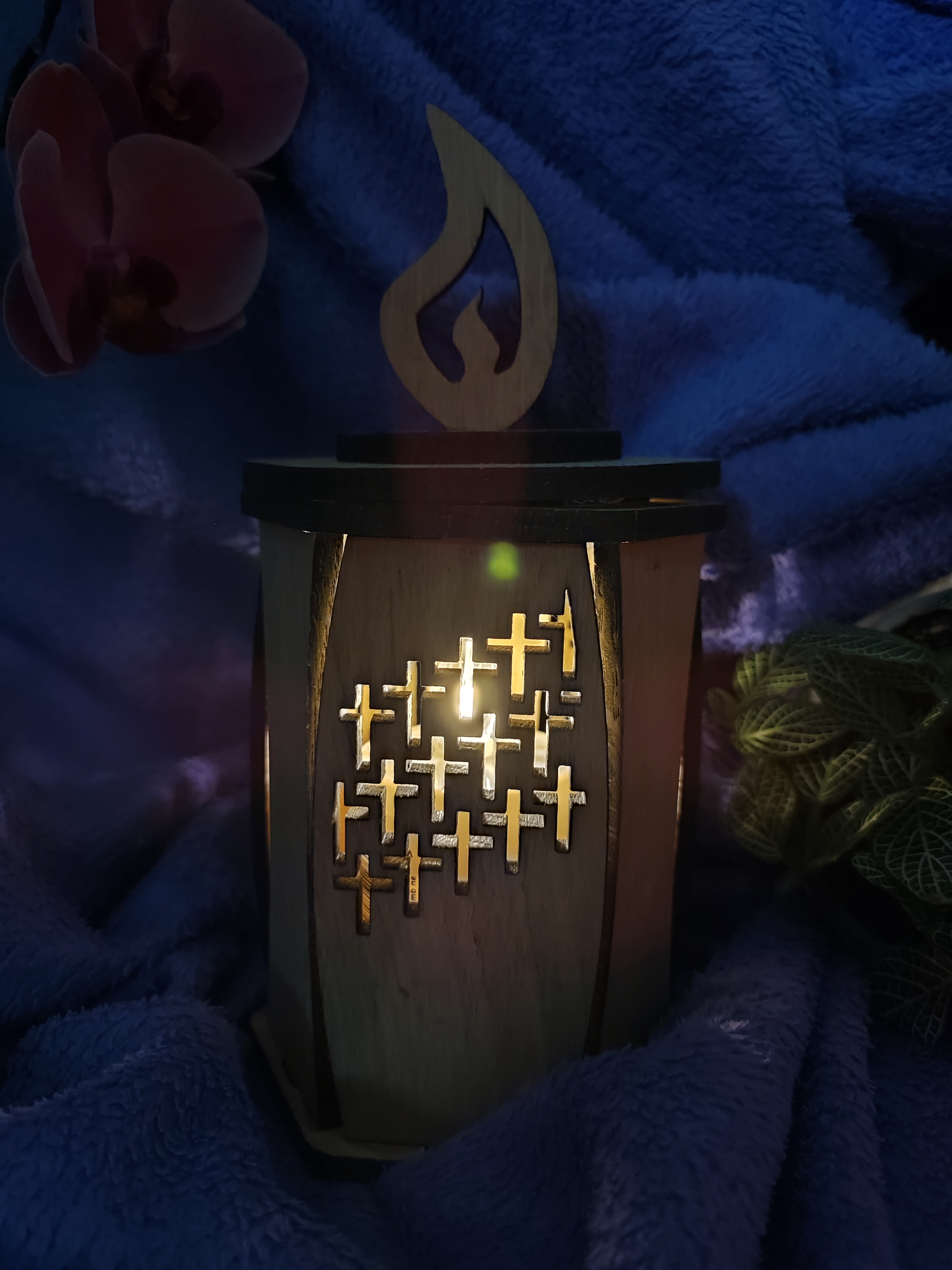 Elegantna laterna z motivom več malih križkov, ki izražajo moč vere, upanja in ljubezni. Simbolika številnih križkov spominja na povezanost, skupnost in večni spomin na drage osebe. Plamen na vrhu poudarja svetlobo in toplino, medtem ko masiven hrast daje laterni trpežen in naraven videz. V notranjosti je prostor za namestitev LED električnega modula, ki poskrbi za nežen svetlobni učinek.