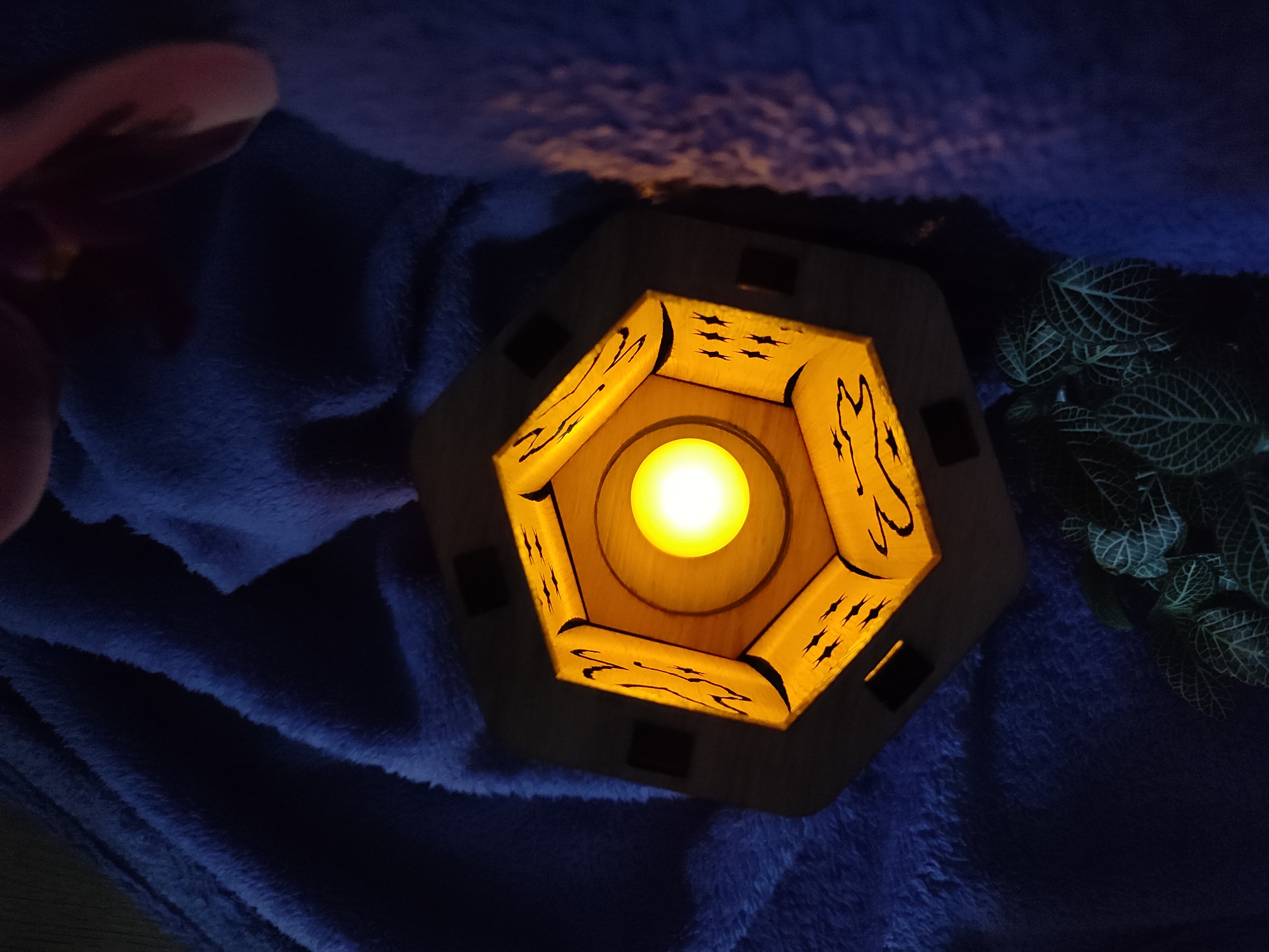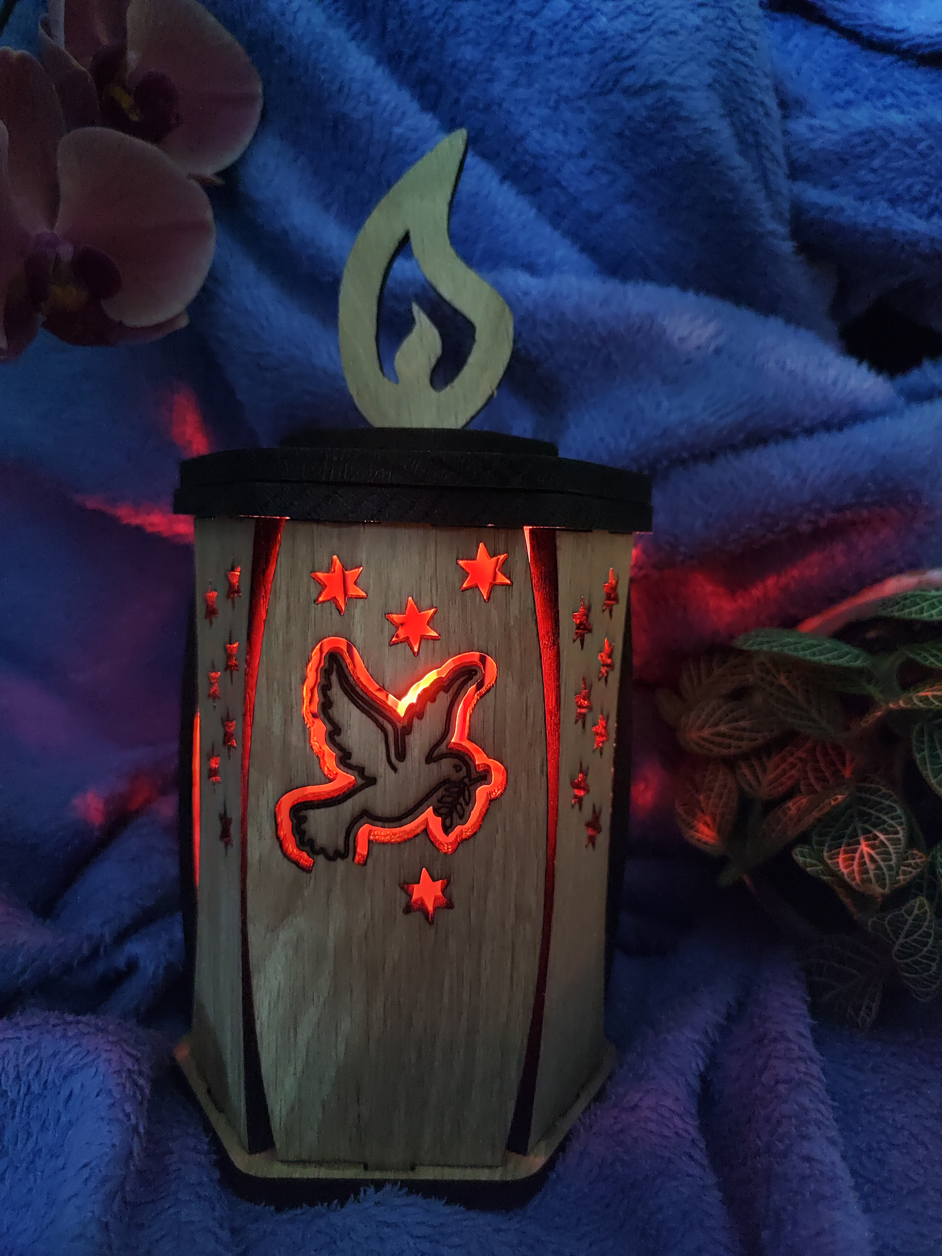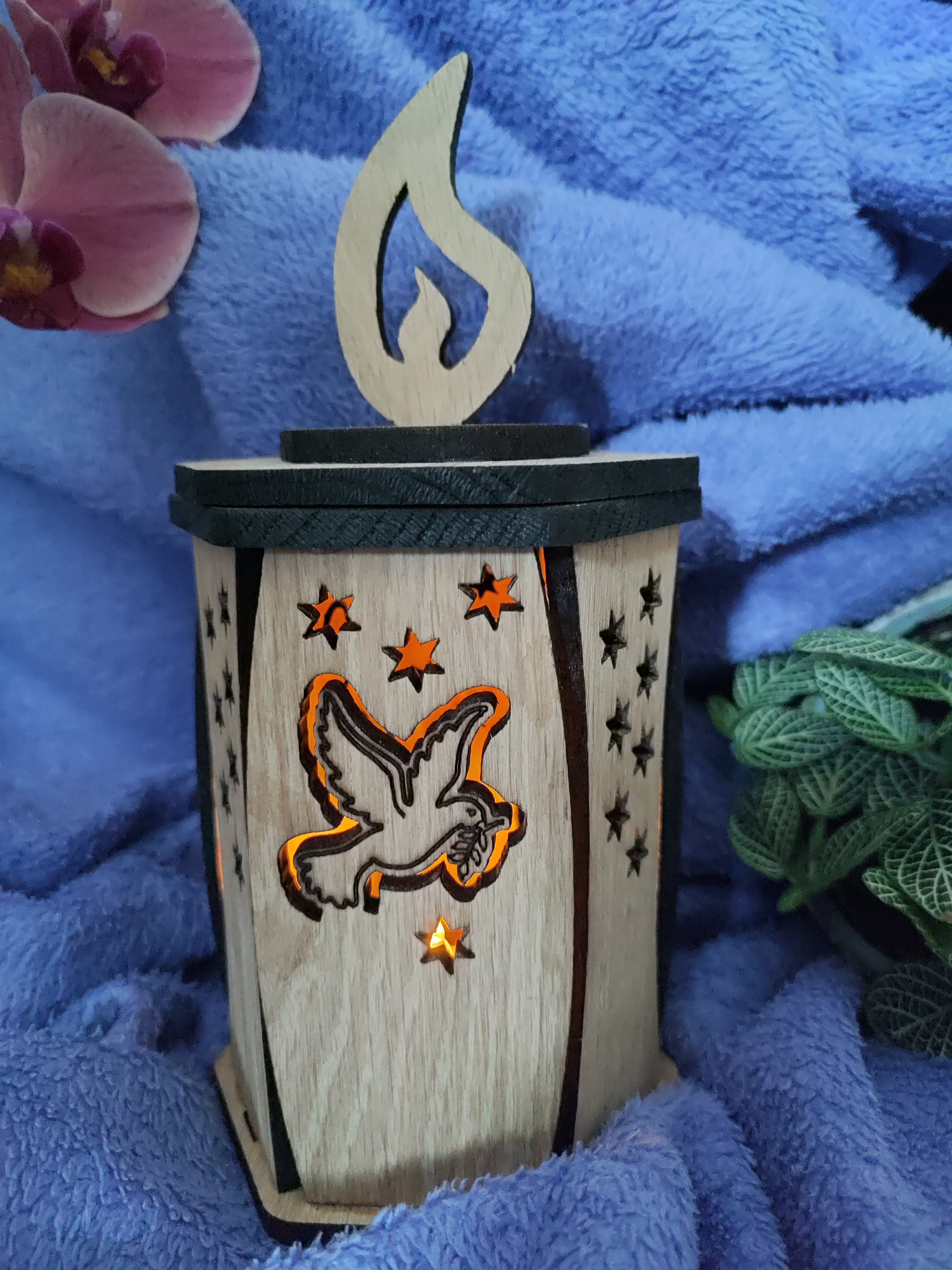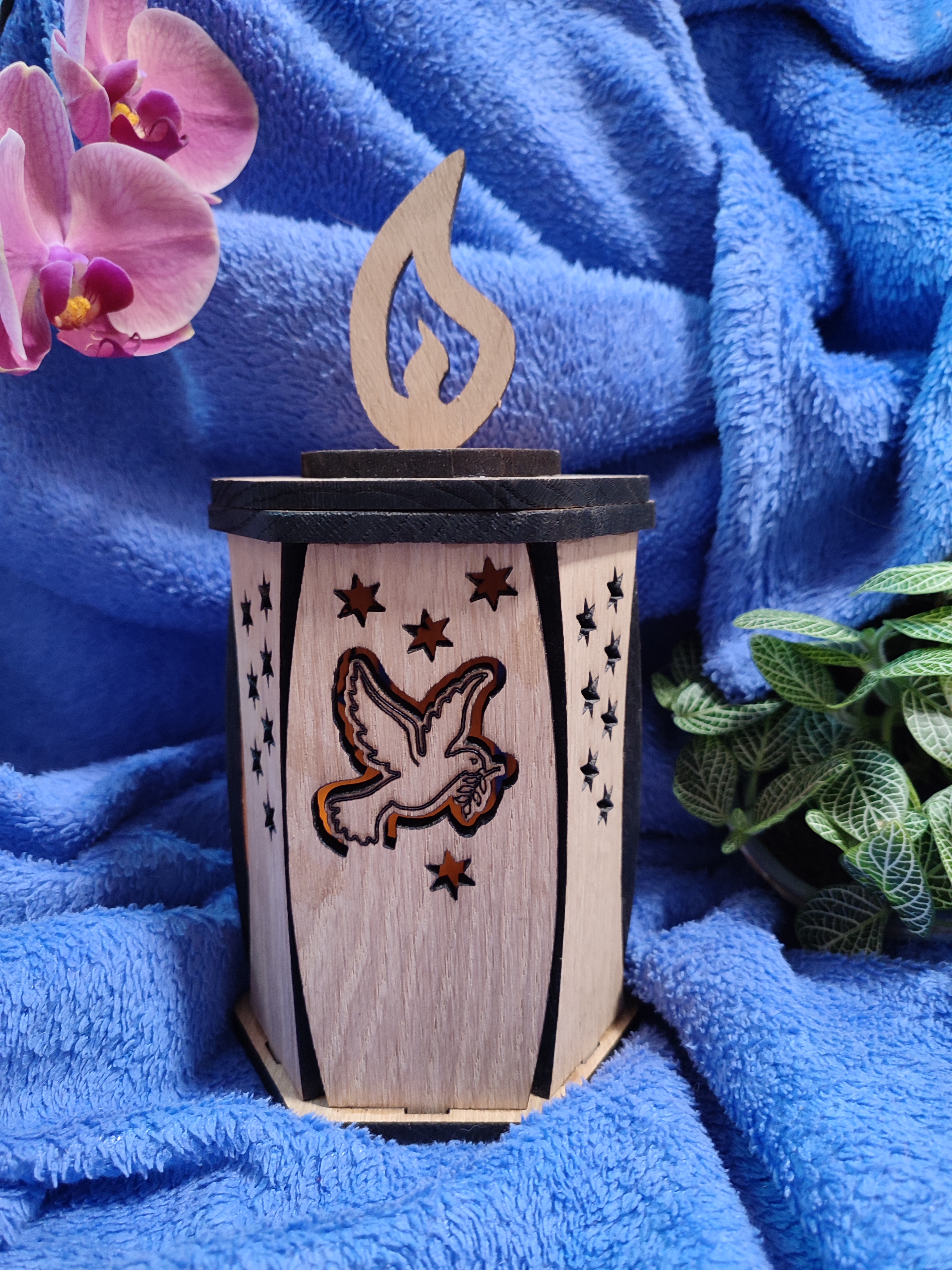 Elegantna laterna z motivom Svetega duha, ki simbolizira mir, blagoslov in duhovno prisotnost. Leseni plamen na vrhu poudarja svetlobo in toplino, motiv goloba pa prinaša občutek upanja in notranjega miru. Laterna je izdelana iz masivnega hrasta, ki zagotavlja dolgo obstojnost ter naraven in eleganten videz. V notranjosti je prostor za namestitev LED električnega modula, ki ustvari prijeten svetlobni učinek.