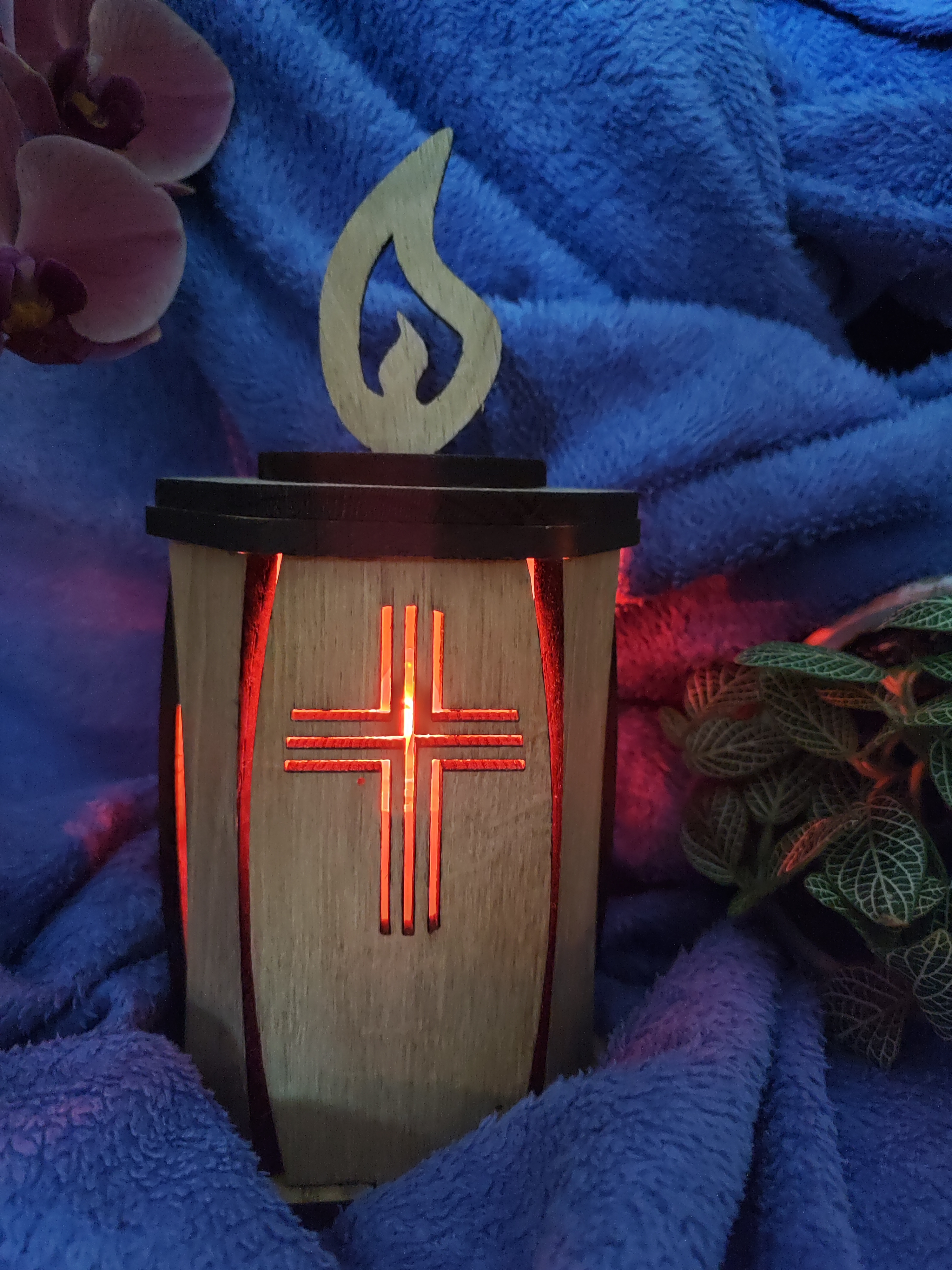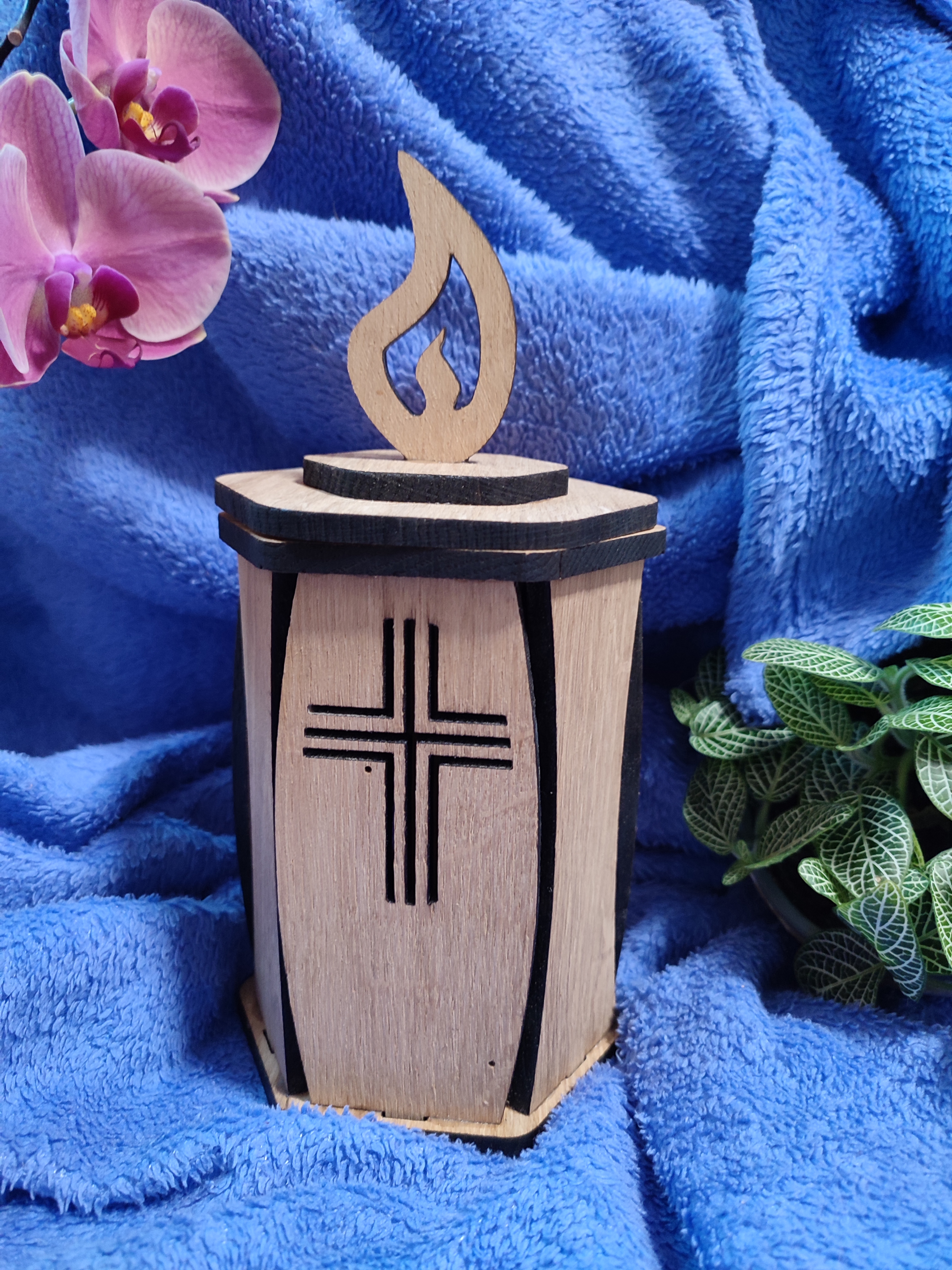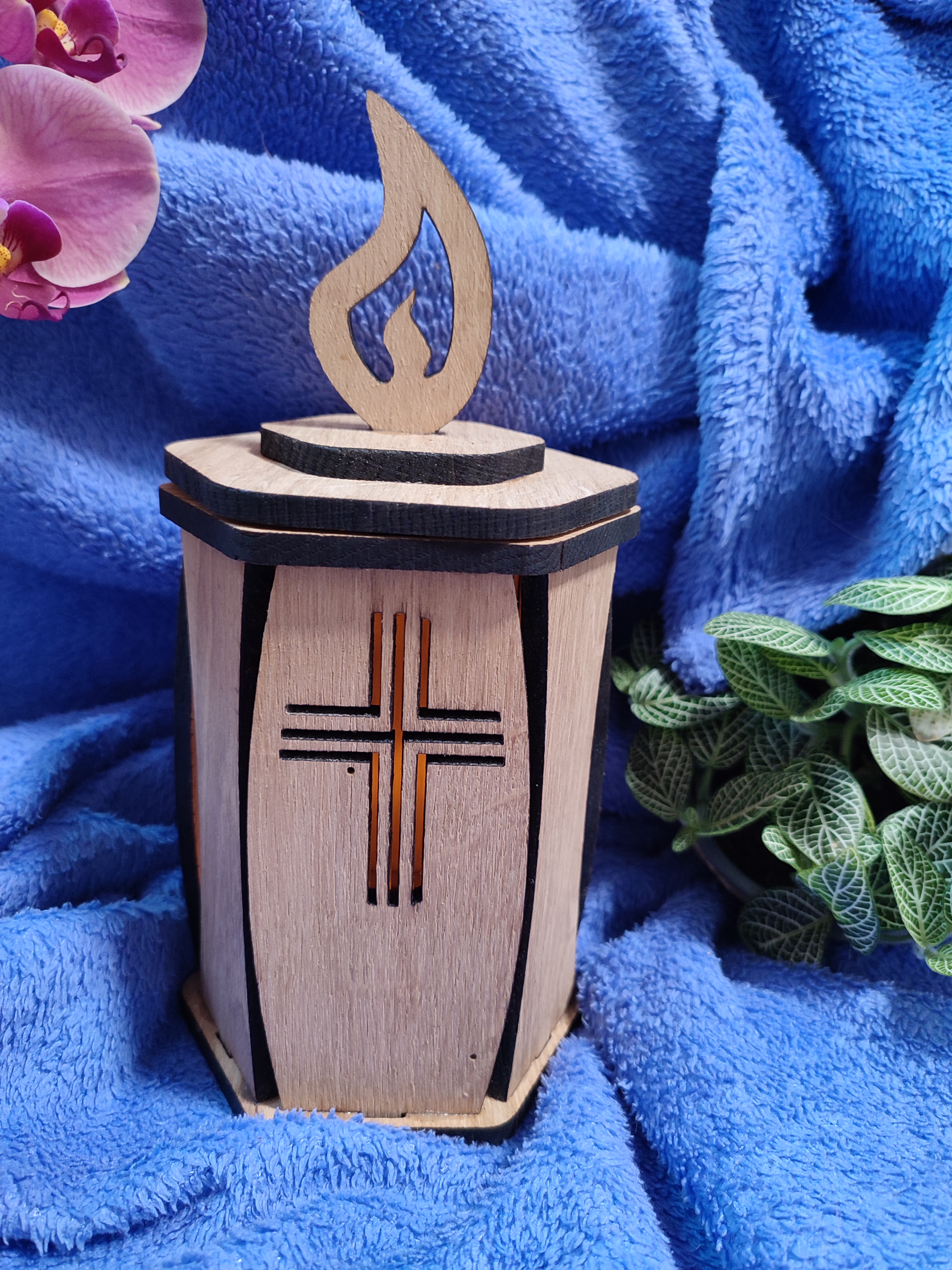 Elegantna laterna z motivom trojnega križa, ki simbolizira vero, upanje in ljubezen. Leseni detajli poudarijo toplino in duhovno globino simbola, plamen na vrhu pa izraža svetlobo in večni spomin. Laterna je izdelana iz masivnega hrasta, ki zagotavlja naraven, obstojen in eleganten videz. V notranjosti je prostor za namestitev LED električnega modula, ki poskrbi za čudovit svetlobni učinek.