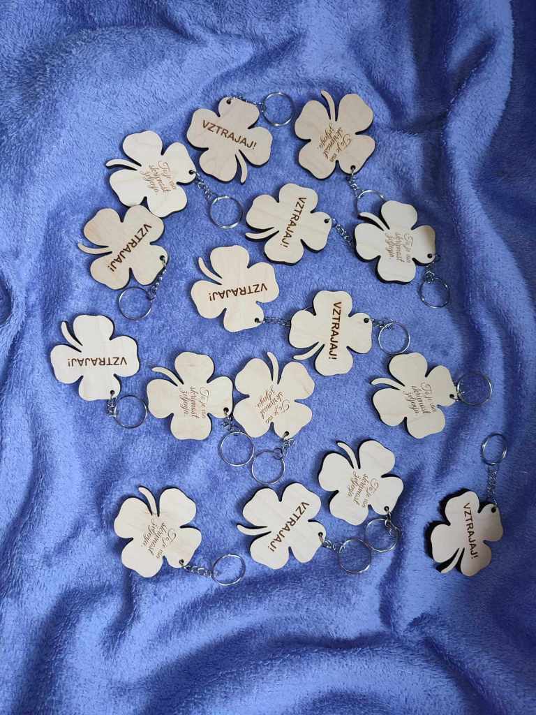 Naši leseni obeski za ključe so lahko različnih oblik in so izdelani iz masivnega hrastovega ali orehovega lesa ali iz vezane plošče. Na obeske lahko graviramo poljuben tekst ali sliko, in sicer na obe strani. So popolna izbira za unikatna darila ali spominke. Na porokah jih lahko uporabite tudi kot sedežni red za goste.