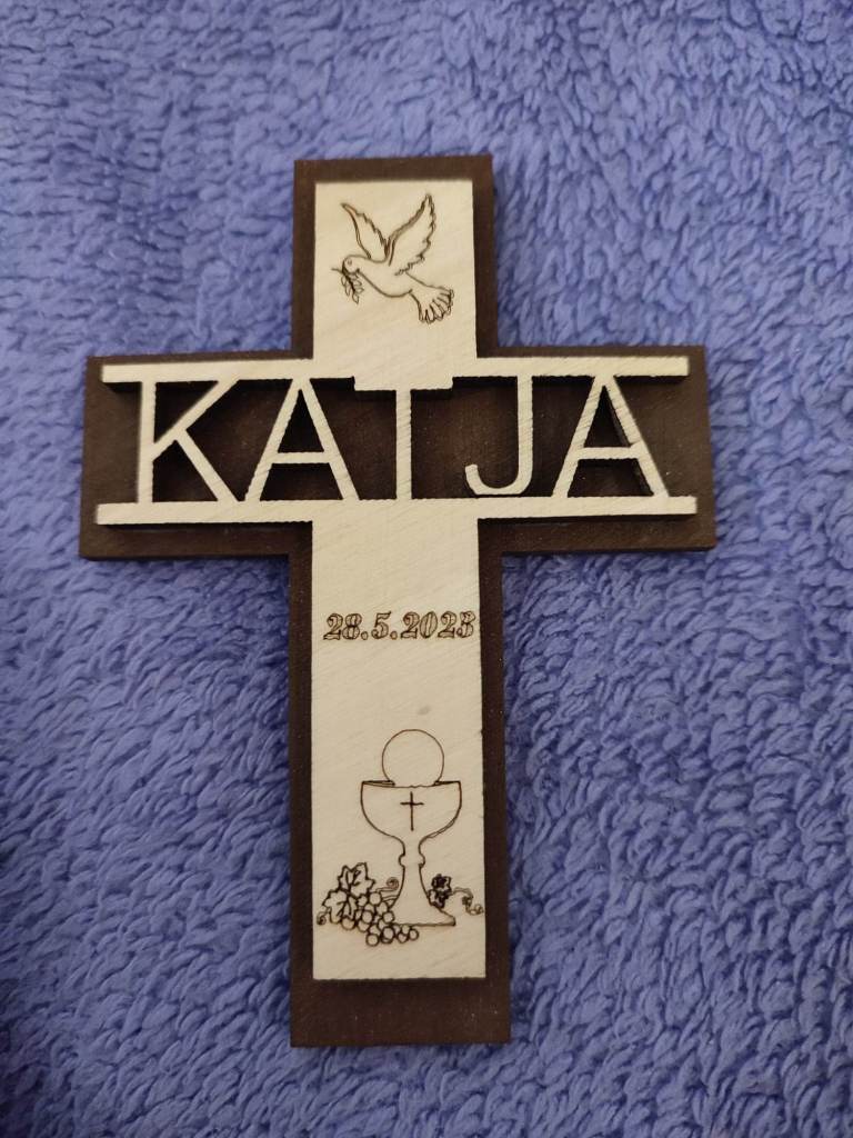 Križki so narejeni iz vezane plošče. Vsebujejo ime prvoobhajanca, po želji pa lahko tudi datum prvega svetega obhajila ter ime praznika. Križku se lahko doda magnet ali obešalo.