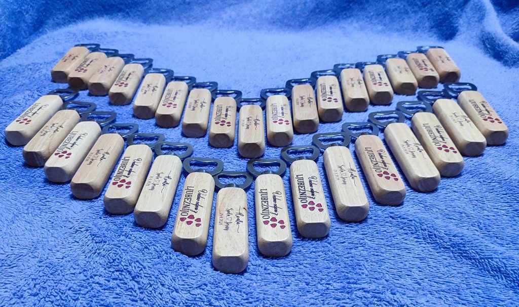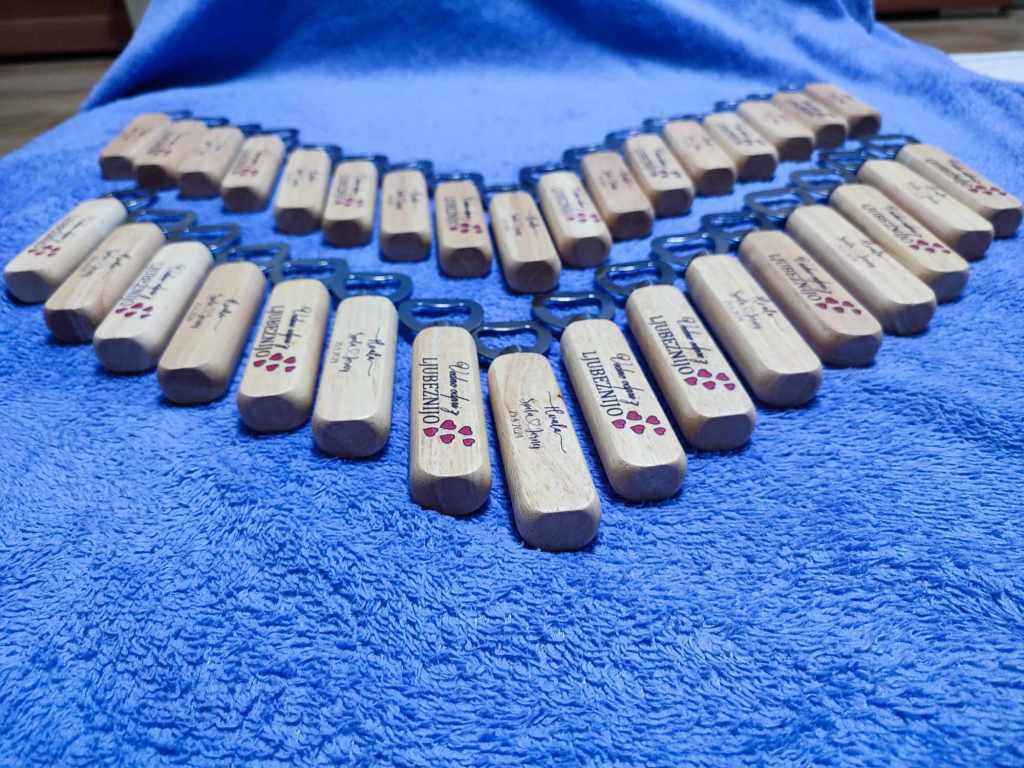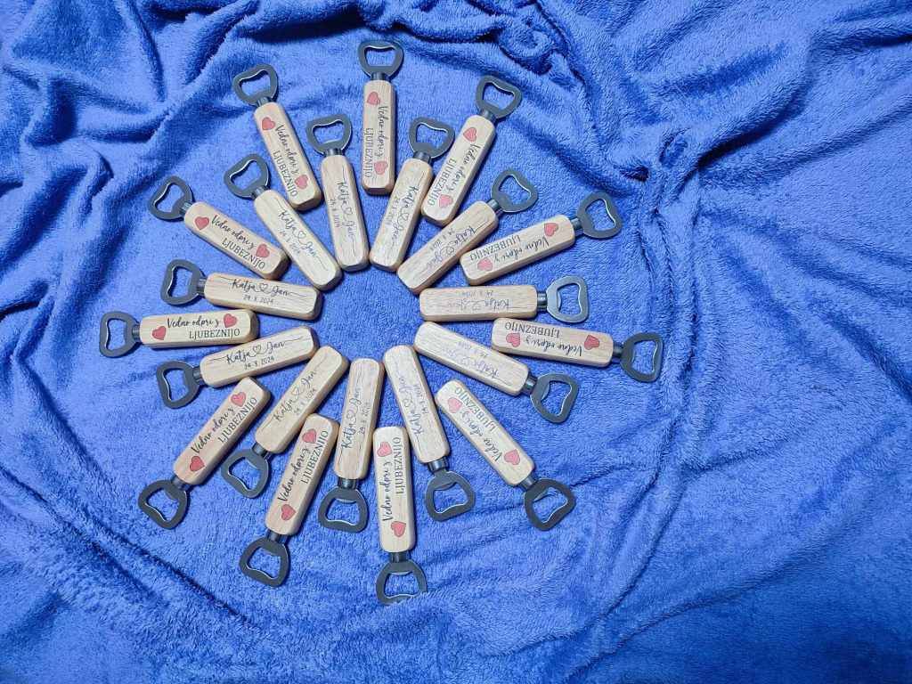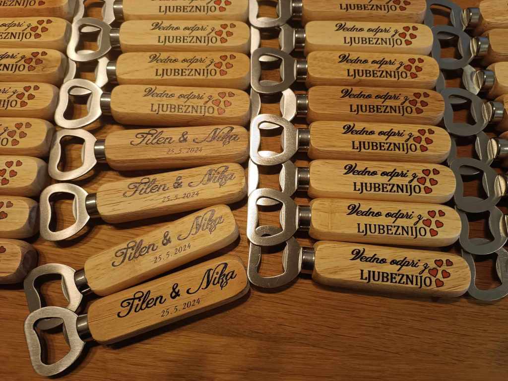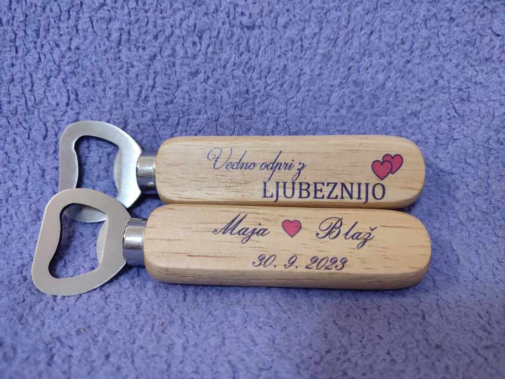Naši leseni odpirači so ročno izdelani iz masivnega lesa in merijo 14 cm x 2,5 cm x 2 cm. Posebnost odpiračev je možnost poljubnega tiska po vaših željah, kar jim doda osebno noto in jih naredi unikatne.