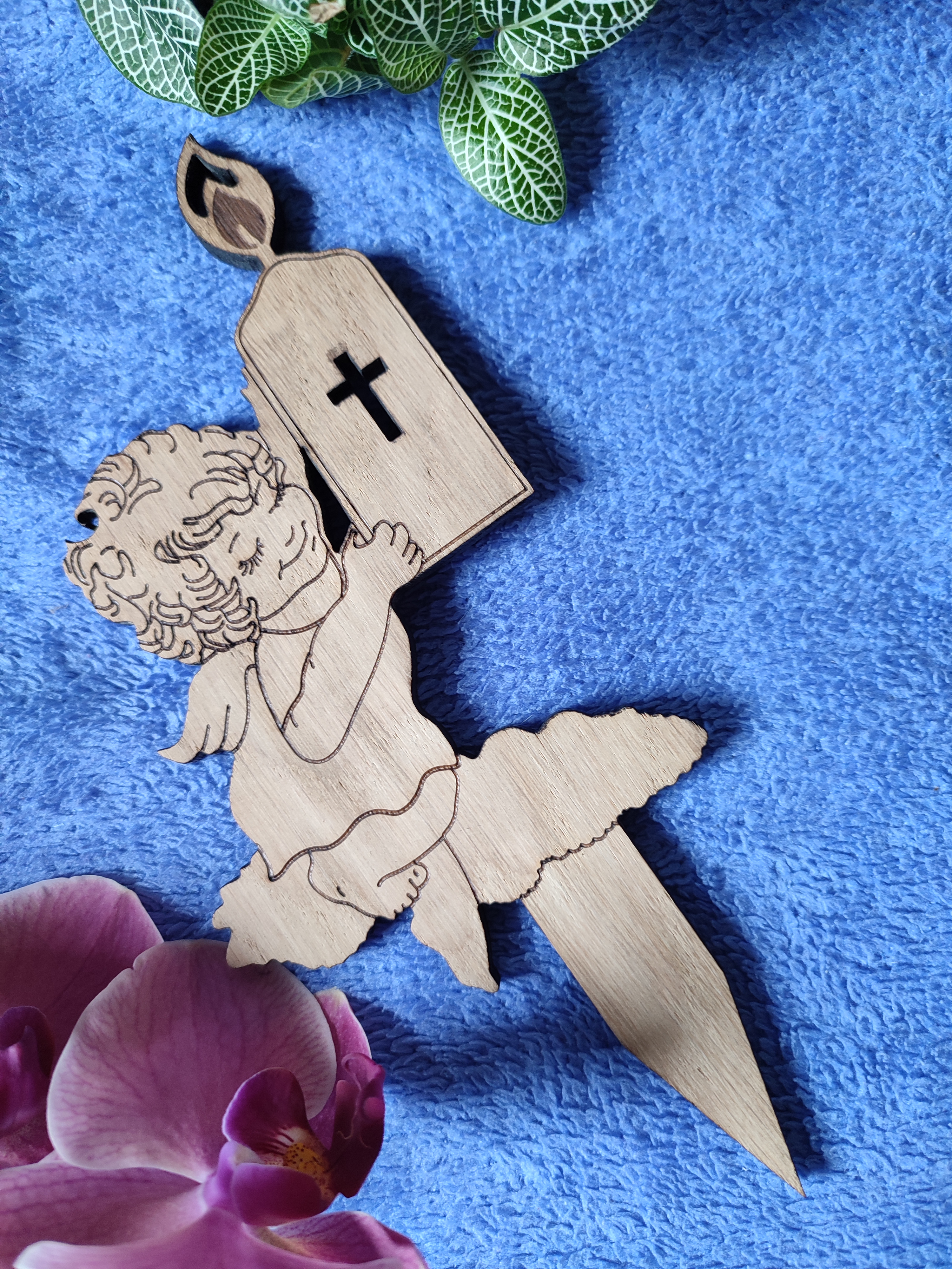Eko nagrobna svečka s podobo angela, ki drži gorečo svečo. Simbolizira mir, varnost in večen spomin. Toplina naravnega hrasta daje izdelku poseben pomen, hkrati pa je prijazna do okolja.