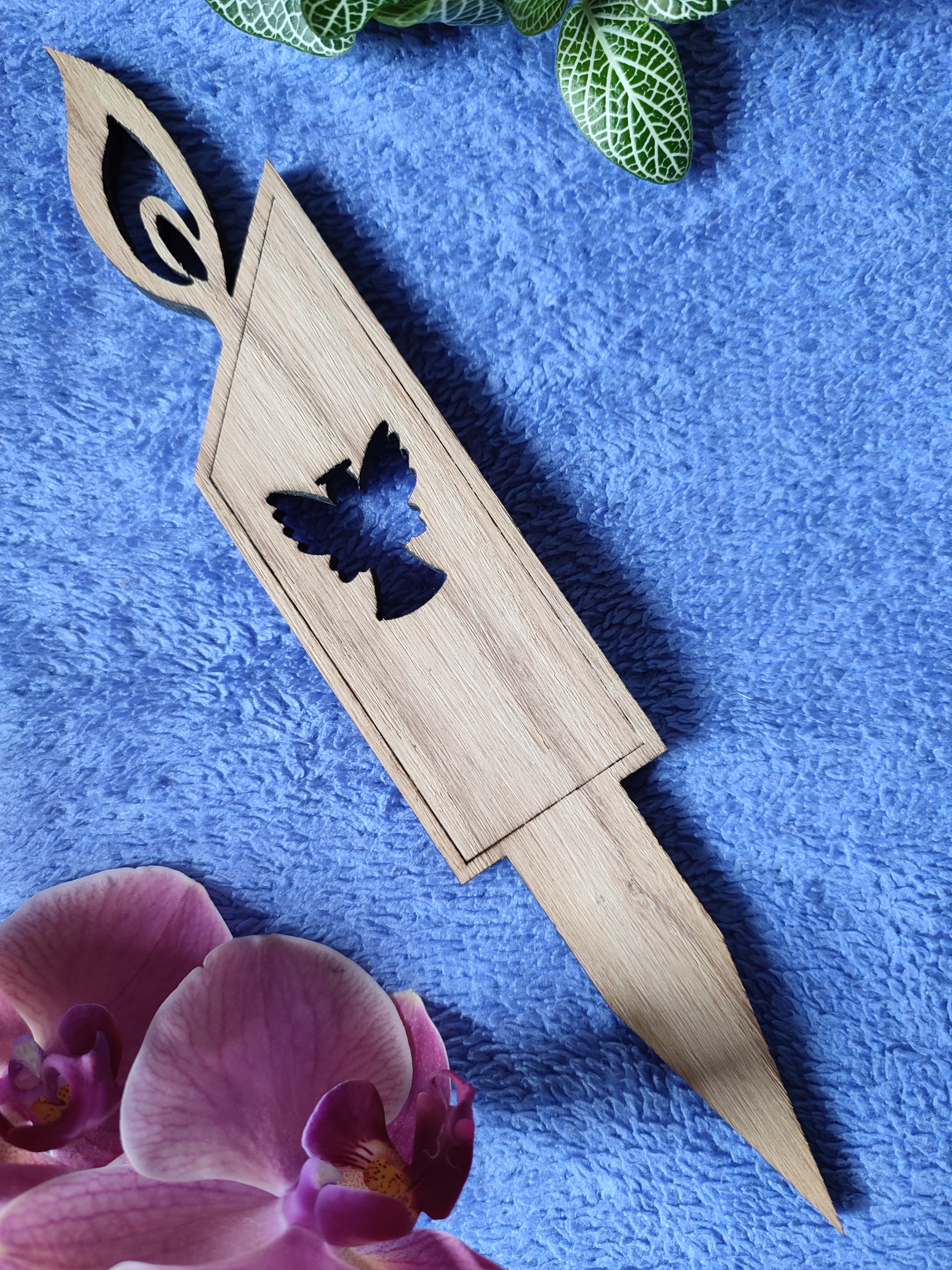 Eko nagrobna svečka s podobo angela. Simbolizira mir, varnost in večen spomin. Toplina naravnega hrasta daje izdelku poseben pomen, hkrati pa je prijazna do okolja.