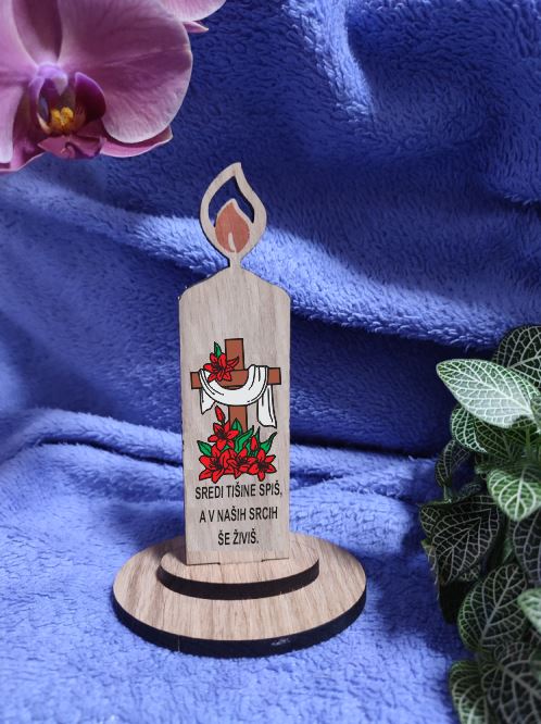 Nežen motiv rdečih lilij z križem simbolizira vstajenje, upanje in večno življenje. Ta svečka izraža spoštovanje, spomin na drage osebe in hkrati prinaša občutek tolažbe in notranjega miru. Izdelana je iz masivnega hrasta, kar zagotavlja dolgo obstojnost ter naraven, eleganten videz.