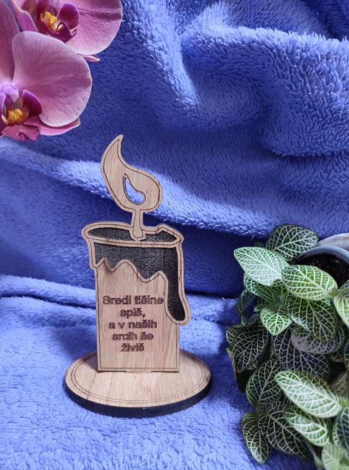 Motiv gravure voska, ki nežno teče po sveči, simbolizira solze spomina in večne ljubezni. Ta svečka izraža tiho spoštovanje in povezanost z dragimi osebami, ki živijo naprej v naših srcih. Izdelana je iz masivnega hrasta, ki zagotavlja dolgo obstojnost ter naraven, spoštljiv videz.