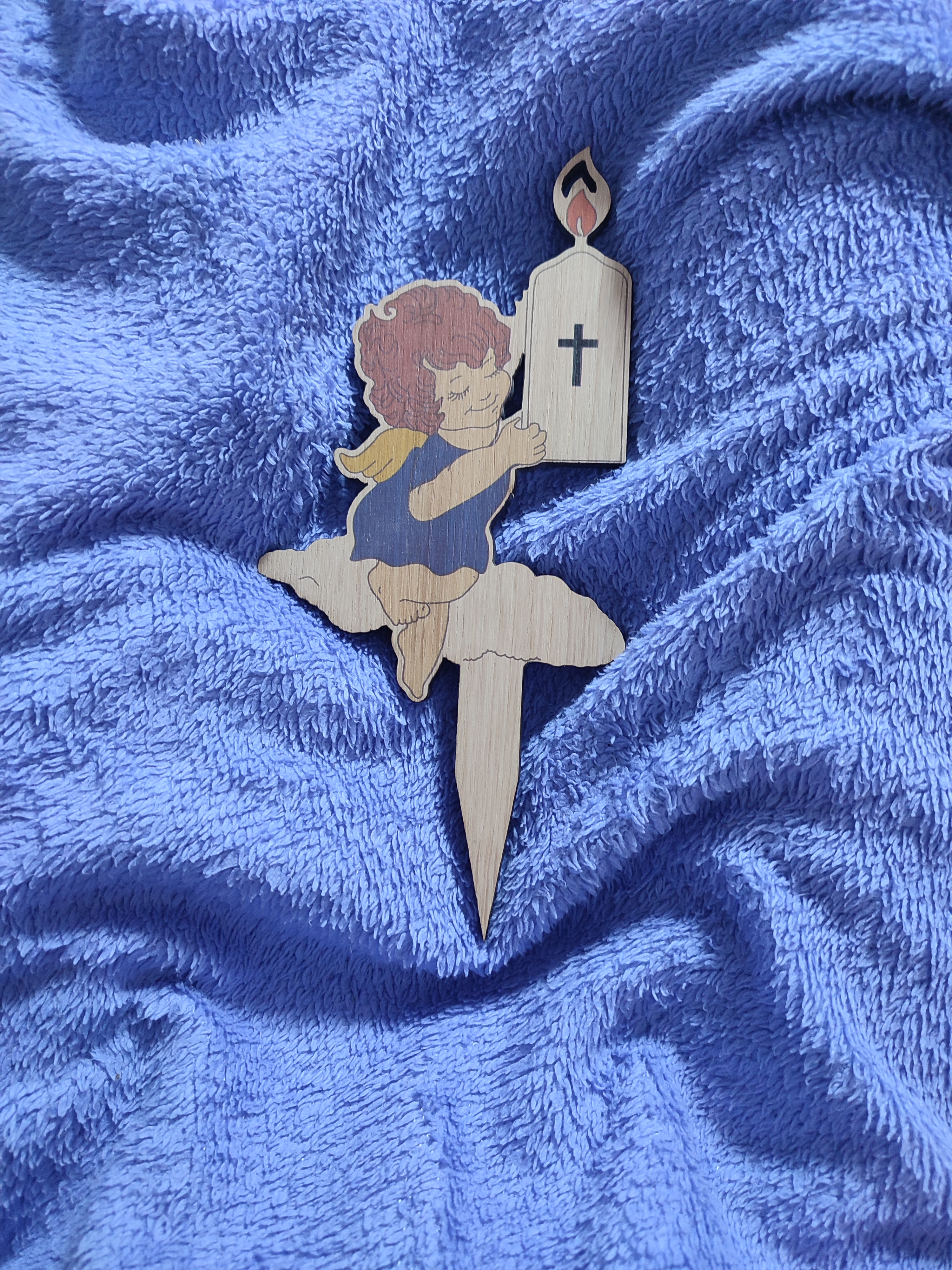 Eko nagrobna svečka s podobo angela, ki drži gorečo svečo. Simbolizira mir, varnost in večen spomin. Toplina naravnega hrasta daje izdelku poseben pomen, hkrati pa je prijazna do okolja.