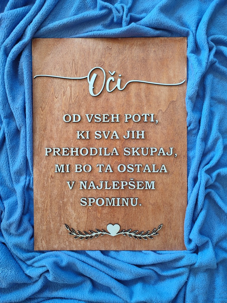 Tabla Ati je čudovit poklon očetu na vajin poročni dan. Izdelana iz kakovostnega lesa, nosi ganljivo sporočilo: “Ati, od vseh poti, ki sva jih skupaj prehodila, mi bo ta ostala v najlepšem spominu.” S to unikatno tablo lahko izrazite hvaležnost očetu za njegovo ljubezen, podporo in vso prehojeno pot do tega posebnega dne.