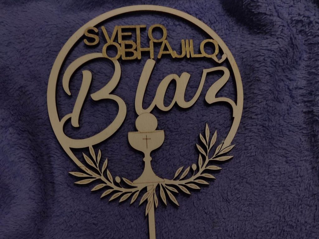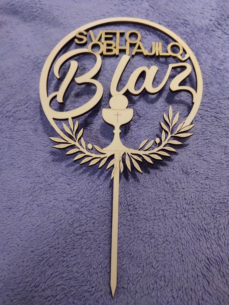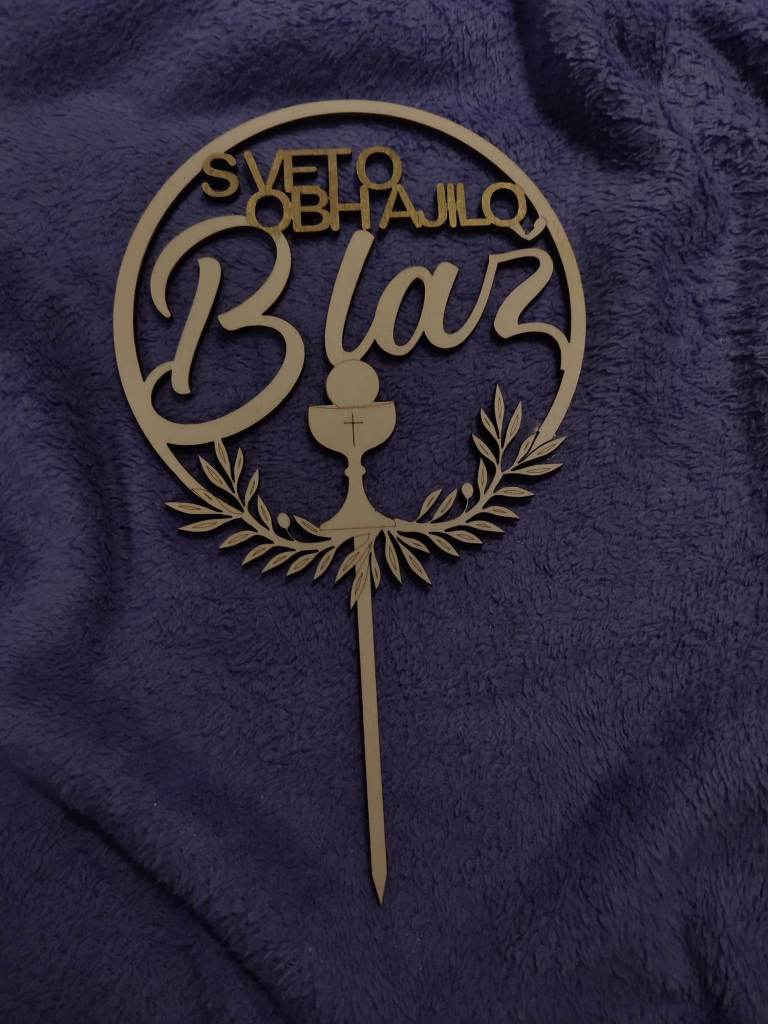 Topper “Sveto obhajilo krog in ime” je izdelan iz vezane plošče. Toper vsebuje ime ter ime praznika. Doda pa se lahko še kakšen motiv (kelih, hostija).
